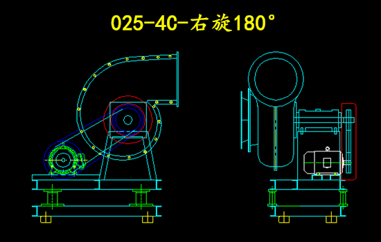 上圖為右旋180°的025-4C風(fēng)機,人站在電機端正視風(fēng)機,風(fēng)機葉輪的出風(fēng)方向為順時針。