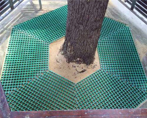 如上圖是一張使用玻璃鋼格柵板制作的樹篦子,首先根據樹池的尺寸以及樹木的直徑對格柵板進行切割,然后使用相應的扣件將其固定在一起。