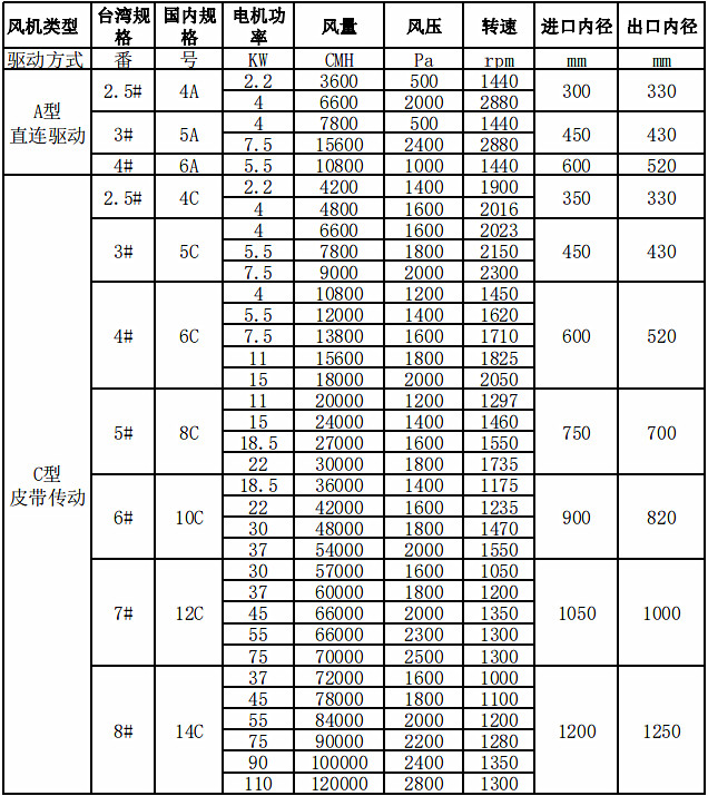 本公司生產的風機引進的技術為臺灣生產,在臺灣風機的型號大小稱作番,代表字母是#,但是在國內統稱為號,用A或C代表。