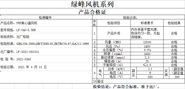 上面介紹的就是常規風機合格證上面所記載的內容,如果風機為特殊類型在合格證上還需要加上一些特殊的檢測項目。如玻璃鋼阻燃風機,在檢測項目中需要加上阻燃性能測試。