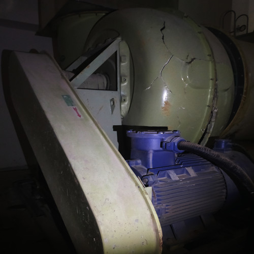 如下圖所示,玻璃鋼風機的外殼以及內部的葉輪都出現了嚴重的損壞,已經無法修補,只能換新。而導致風機損壞的主要原因是操作失誤,一段金屬角鋼在焊接管道時掉落,從風管內部進入了風機中。在風機葉輪高速旋轉的作用下,導致外殼破裂以及葉輪的葉片出現大面積損壞。